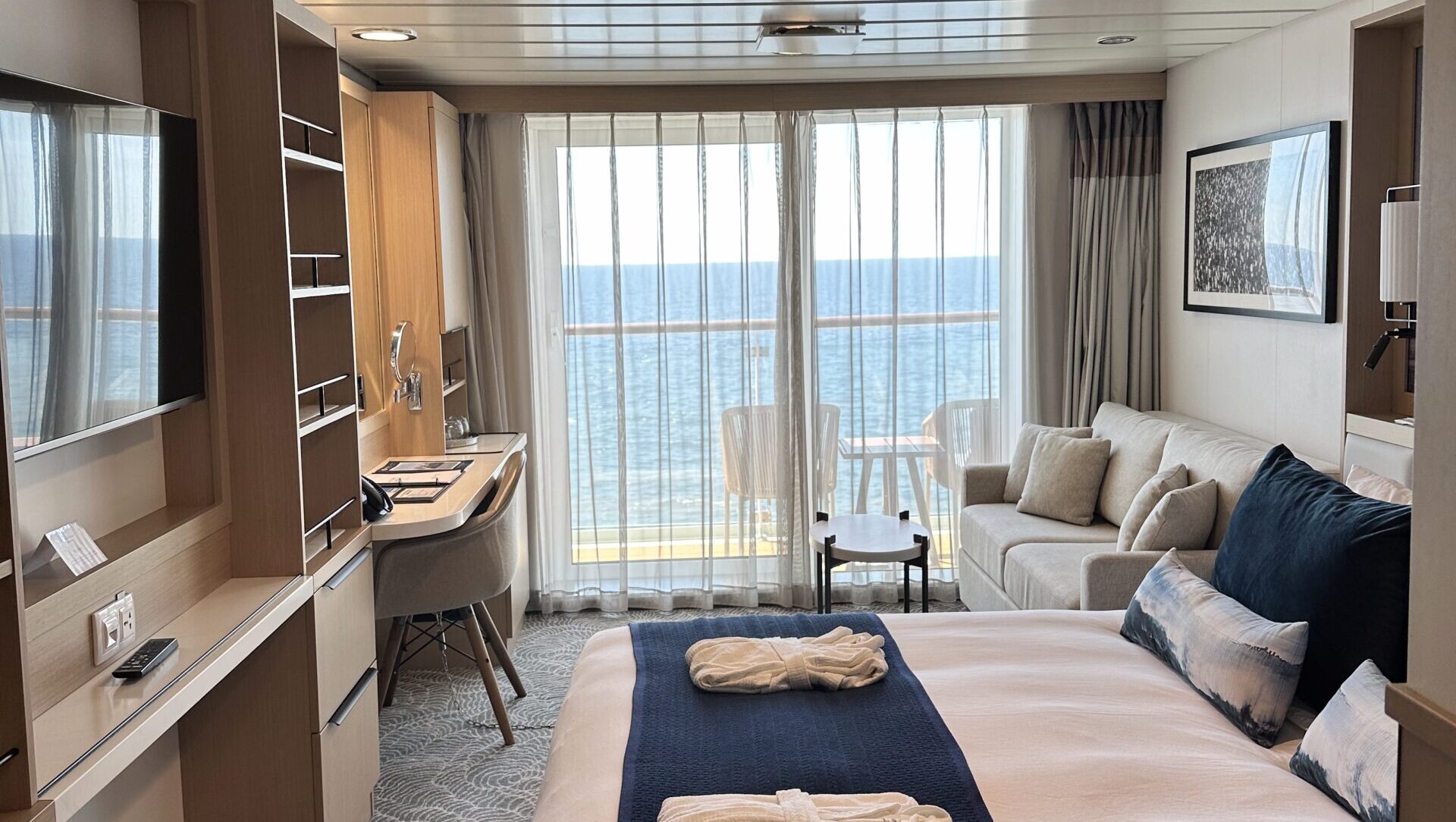 When it’s time to unwind, the cabins deliver. I stayed in CSP (Superior Balcony Stateroom) 639—spacious, quiet, and well positioned at the back of the ship. These cabins with a sitting area, desk/vanity table, large TV, fridge and a shower bathroom. Most people choose midship cabins to help with seasickness, but I’d recommend this one for its easy access to Deck 7 and the jacuzzi, just steps from the balcony. I loved the provided dressing gown, making for a comfy post shower chill out before dinner, after a day of exploring. There is no need to dress up for dinner here, whatever you feel comfortable in.