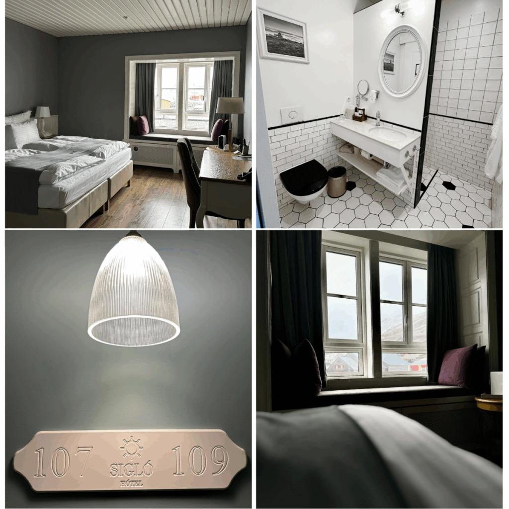 Compared to Akureyri, with a population of almost 20,000, by contrast, Siglufjörður, with a handful of shops and a population of 1200 people, felt much more tucked away. A true Icelandic fishing village, edged by sea and mountains. Our base for the night was the Sigló Hotel, which looked more like a traditional boathouse than a hotel. With only 68 rooms, it felt intimate from the start. Wood panelling, and light green colours that blended into the landscape rather than competing with it.