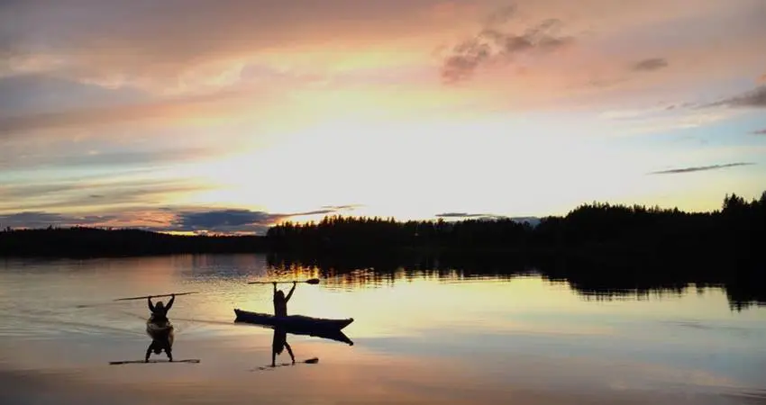 The camp is a haven for summer outdoor activities. Guests have full complimentary access to paddle boards, canoes, kayaks, and fishing equipment to explore the vast river system. After a day under the sun, relax in the floating lakeside sauna. Ideal for those seeking Midnight Sun holidays, Swedish Lapland summer activities, luxury kayaking trips, or river glamping in the northern wilderness. All meals and essential summer activity gear are included.