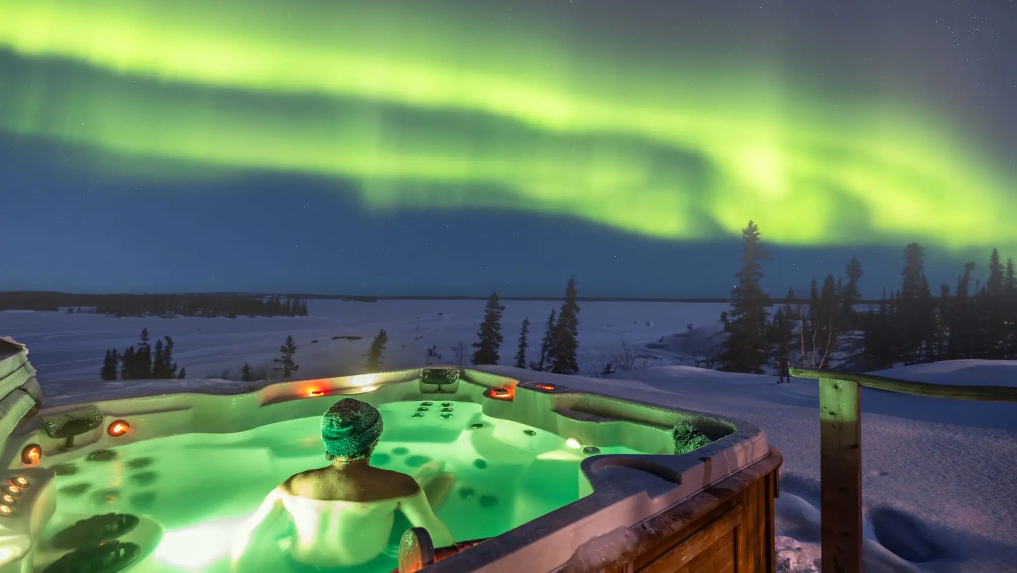 Experience the Northern Lights in pristine wilderness at Blachford Lake Lodge, set directly beneath the auroral oval near Yellowknife. Your arrival to the lodge begins with an unforgettable scenic bush-plane flight, which lands on Blachford Lake by skis in the winter months. The main lodge features six cosy rooms with rustic décor and expansive lake views, while the nearby log cabins also offer lake views and wood-burning stoves for an authentic northern experience. Locally inspired, gourmet cuisine is served using freshly caught fish, game, seasonal vegetables, and produce from the lodge’s own organic garden. After meals in the welcoming dining room, guests can relax by the fireplace or in the sauna, browse the library, or watch the aurora borealis dance overhead in the outdoor hot tut. There is a wide range of winter activities to enjoy here, including skiing, snowshoeing, snowmobiling, ice fishing, skating, curling and igloo building. With guided aurora viewing and a serene remote setting, Blachford Lake Lodge offers an unforgettable northern wilderness escape.