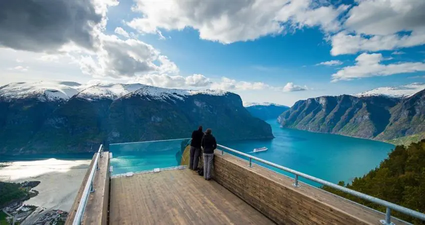 From Aurland there are several places to visit before making your way north. Just a 20 minute drive away is Stegastein Viewpoint, a famous structure overhanging the edge of the mountain plateau 650 metres above sea level. It offers spectacular views of Aurland below, and the beautiful Aurlandsfjord and surrounding mountains.