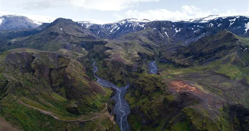 Trek Day 3 — Álftavatn to Emstrur continues the journey for a distance of approximately 15 km (9.5 mi). You will cross a stream and then trek across the vast black sand desert of Mælifellssandur, enjoying views of the distant glaciers. A major highlight is viewing the impressive, deep Markarfljótsgljúfur Canyon before reaching the green oasis of Botnar in Emstrur for your third night in a mountain hut.