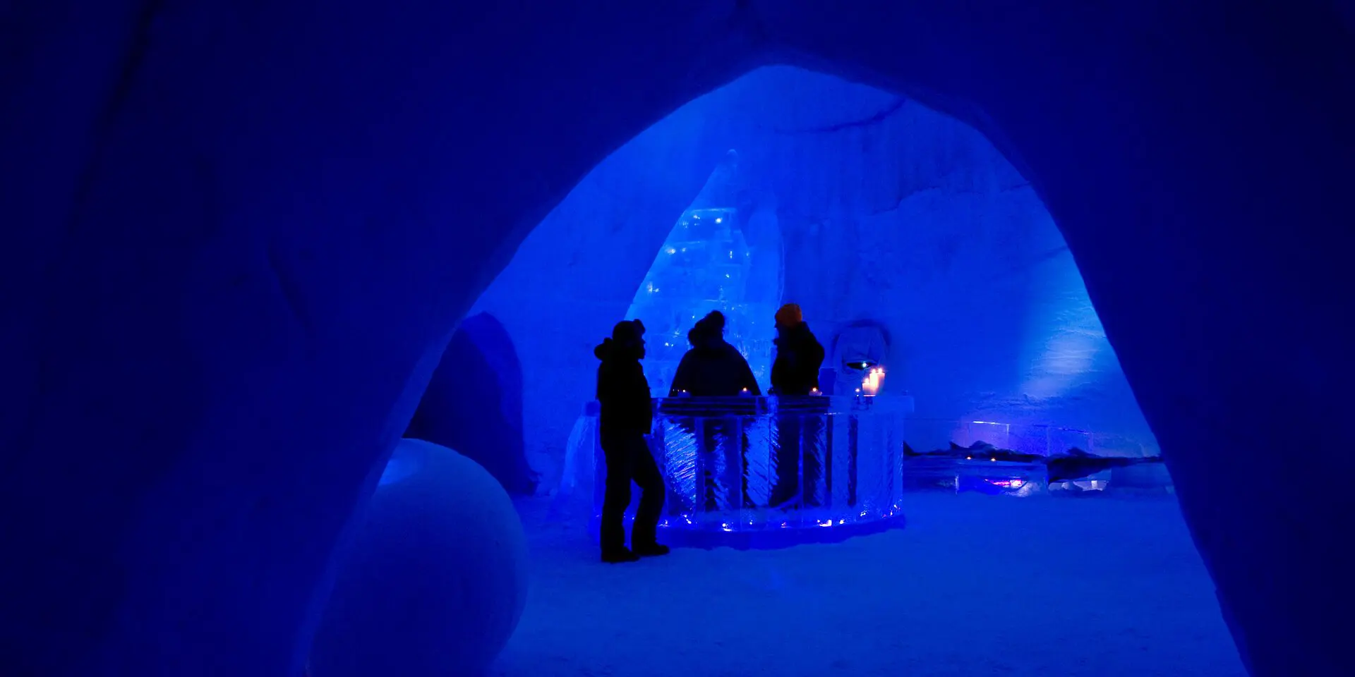 Overnight in snow rooms with carved ice and snow designs, plus two nights in cosy cabins