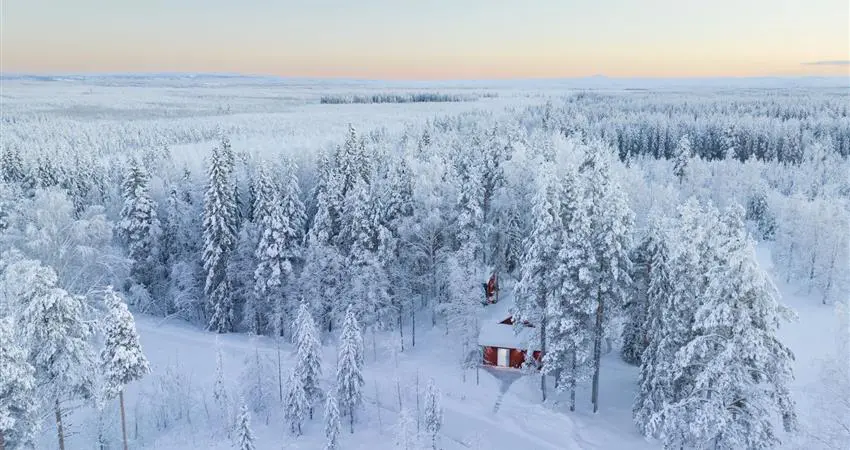 Your winter adventure begins with a private transfer from Luleå Airport to Loggers Lodge, a journey of approximately 90 minutes. The final part of the transfer takes you along a private, tree-lined track—a magical way to arrive and fitting for this exclusive lodge. Your accommodation is a luxurious red timber cabin nestled in the forest, with an additional modern glass cabin just a few metres away, ideal for older children wanting their own space.