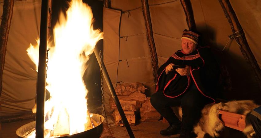 In the evening, enjoy storytelling around a campfire in a traditional teepee style tent used by the Sámi people.