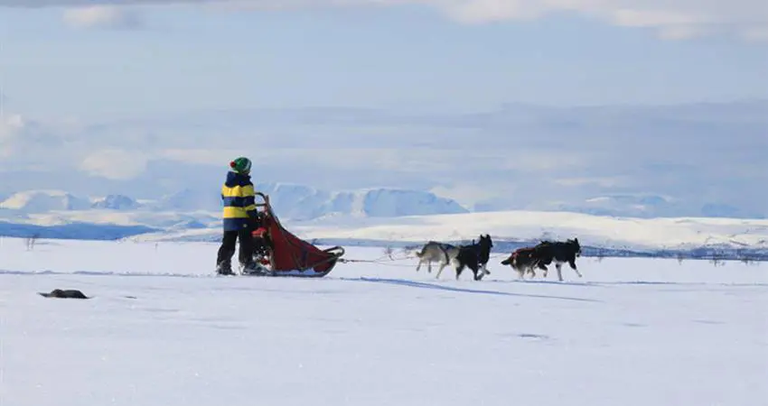 After breakfast, you will be welcomed by the guide who will accompany you on the 4 day trip, providing you with practical information and a briefing session on what to expect during the adventure. Next, you’ll head to the on site kennels and meet the excitable dogs who will be in your team, and your new friends for the next few days. You’ll learn about the equipment, help to harness the dogs and receive safety instructions before embarking on the trip. You’ll quickly get to know the individual names and characters of the dogs, each person taking responsibility for their own sled team.