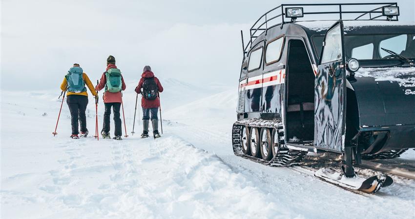 Take part in unique winter activities including dog-sledding, snowshoeing, and a snowcoach ride